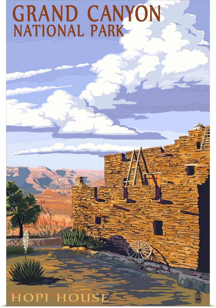 <p>Retro stylized art poster of an old shelter made of stone. Overlooking a massive canyon.</p>