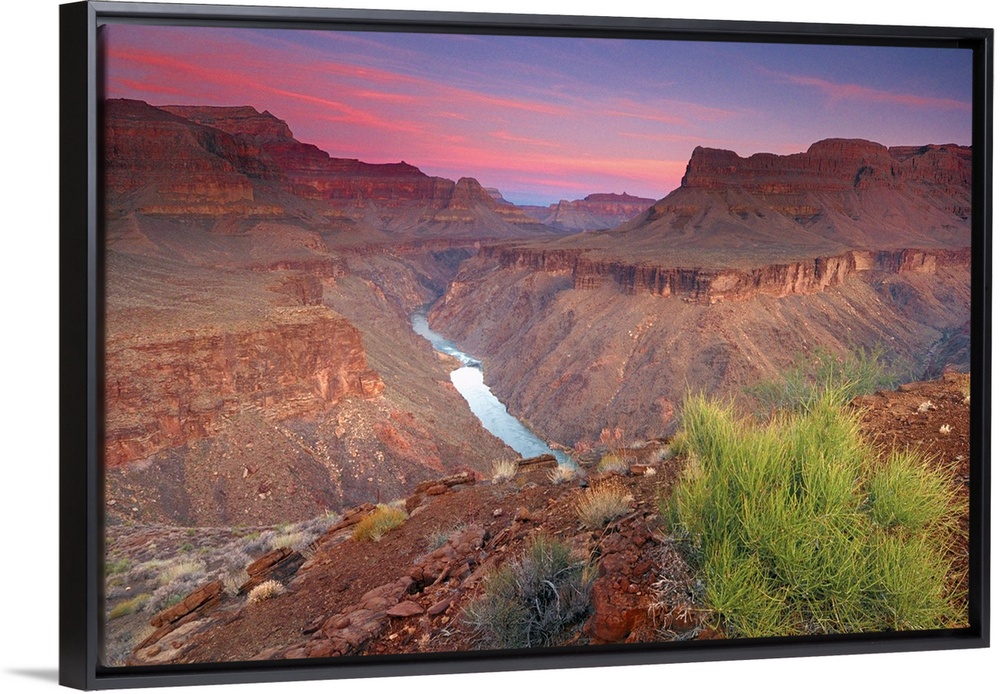 <p>The sun rises on the red rocks of the Grand Canyon as the Colorado River roars down below.</p>