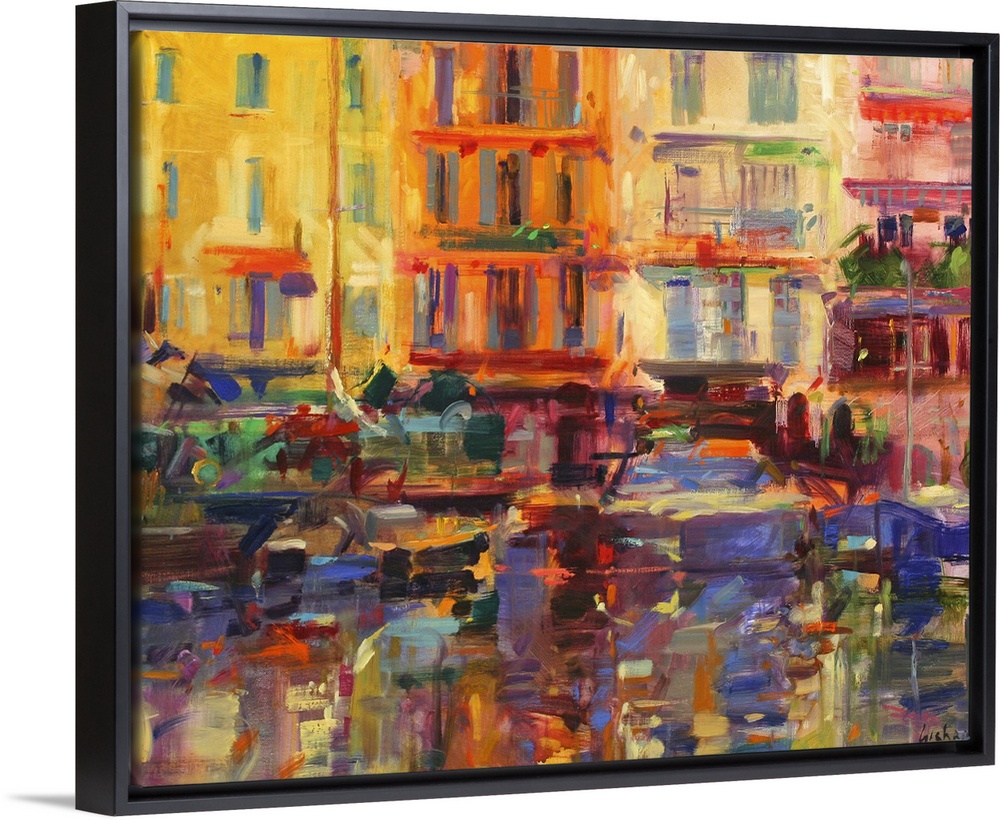 <p>Contemporary art painting of buildings overlooking a boat filled harbor.</p>