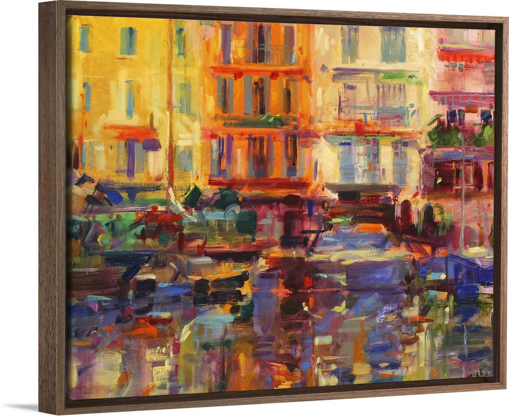 <p>Contemporary art painting of buildings overlooking a boat filled harbor.</p>