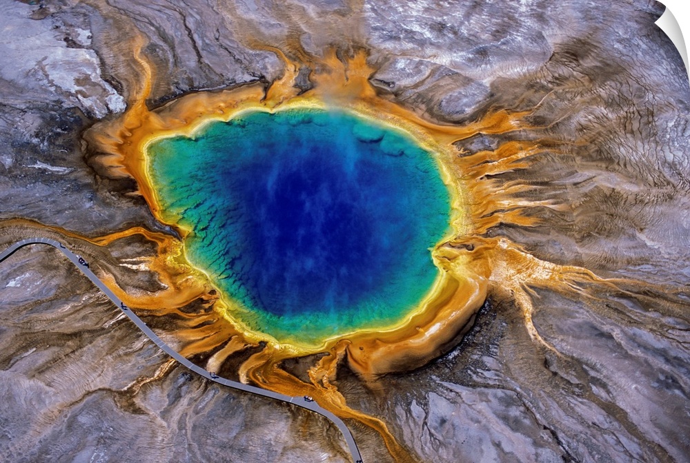 <p>Vibrant colours of the Grand Prismatic Spring in Midway Geyser Basin of Yellowstone National Park, Wyoming, United States of America. Grand Prismatic Spring, one of the largest and most beautiful examples of a common hydrothermal feature in Yellowstone National Park.</p>