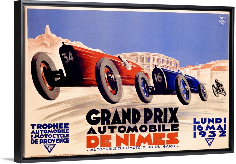 <p>Classic promotional artwork for the 1932 Grand Prix de Nimes in France featuring two cars and a motorcycle racing on city streets with landmarks and houses visible in the background.</p>