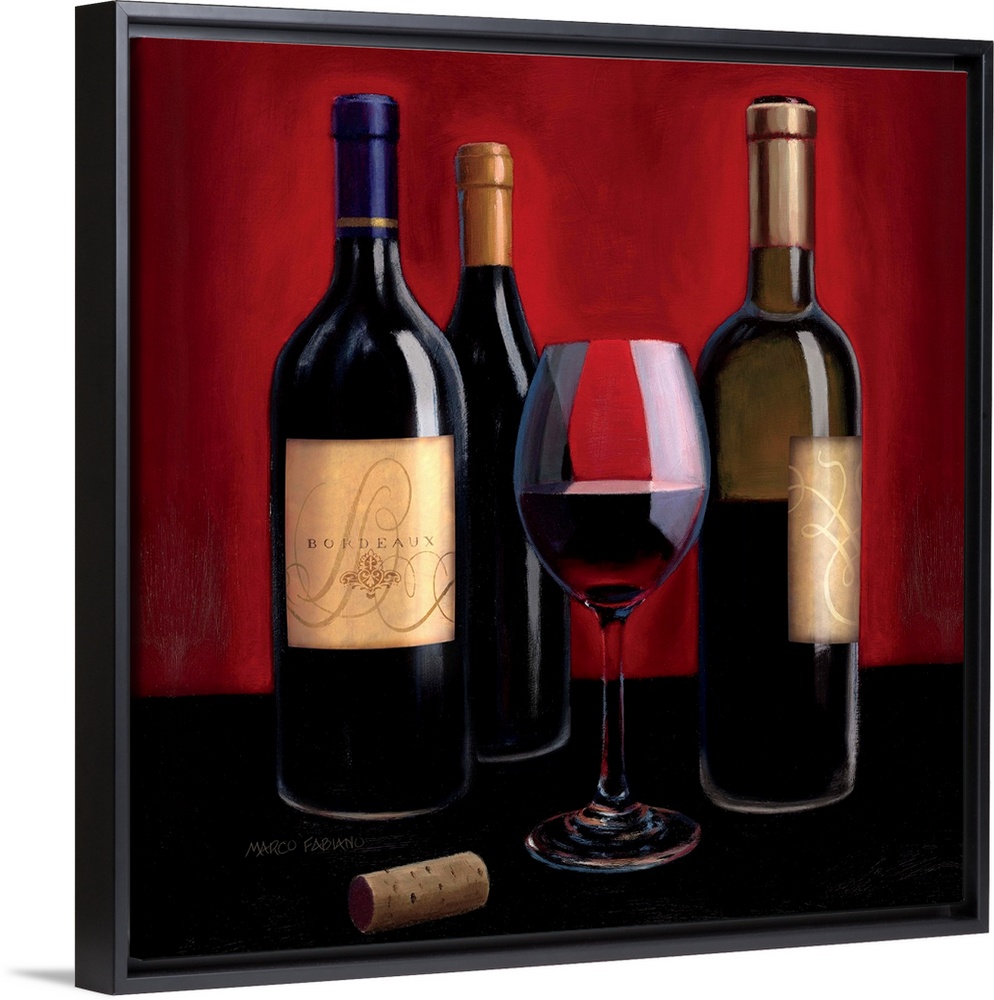 <p>Contemporary painting of a glass of red wine surrounded by wine bottles.</p>