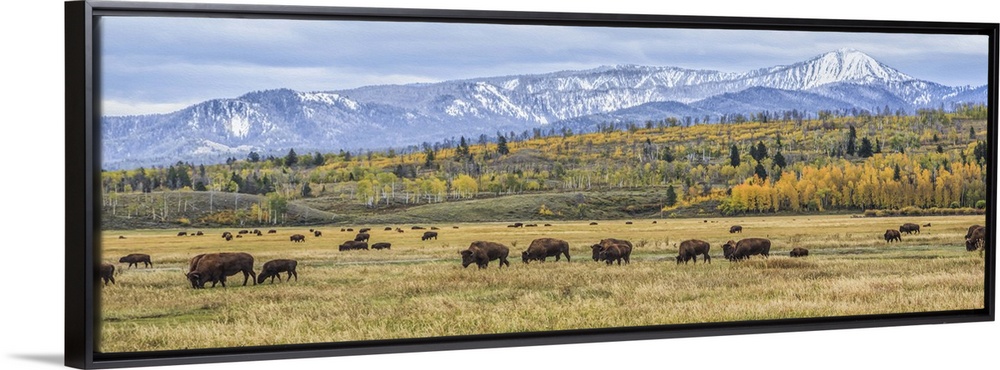 <p>A photograph of bison grazing on the plains below the Teton mountains.</p>