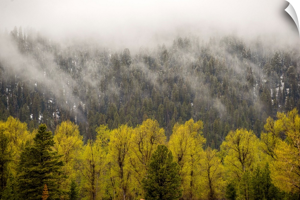 <p>View of fog cascading over trees in Grand Teton National Park, Wyoming.</p>