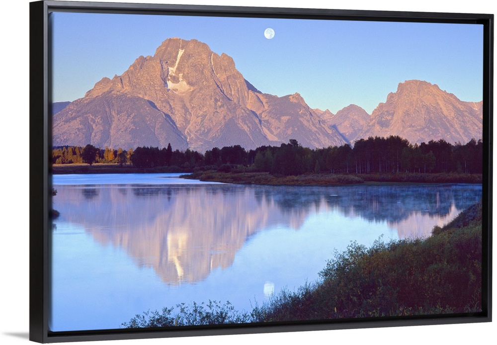 <p>The moon over the Grand Tetons in Wyoming, reflected in the lake below.</p>