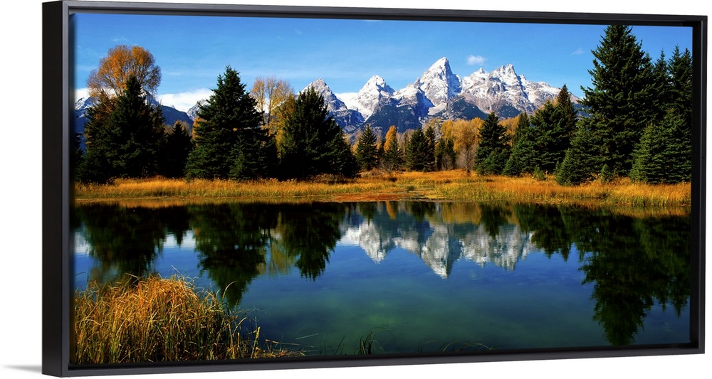 <p>Panoramic view of the Grand Tetons reflected in a lake in Wyoming.</p>