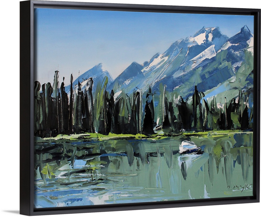 <p>Contemporary palette knife painting of green trees lining a body of water with mountains in the background.</p>