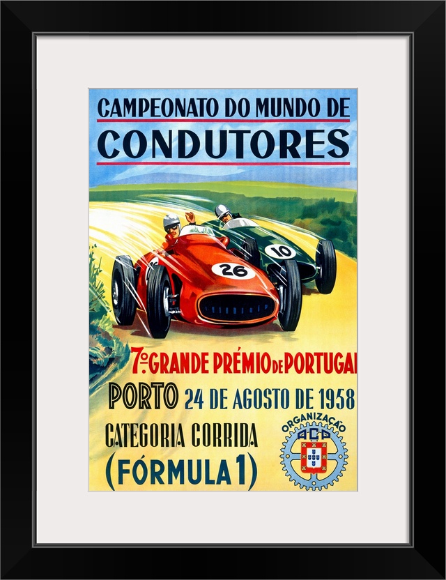 <p>Vintage Formula 1 promotional poster of two racecars rounding the curve on a dusty track.</p>