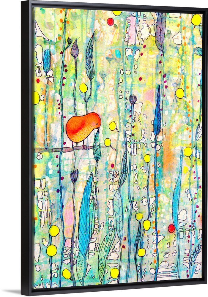 <p>Contemporary painting of a bird against a colorful background.</p>