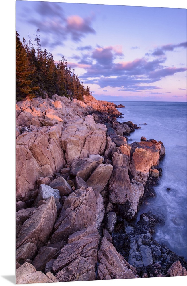<p>Photograph of a rocky coastline with beautiful lighting from the morning sunrise.</p>