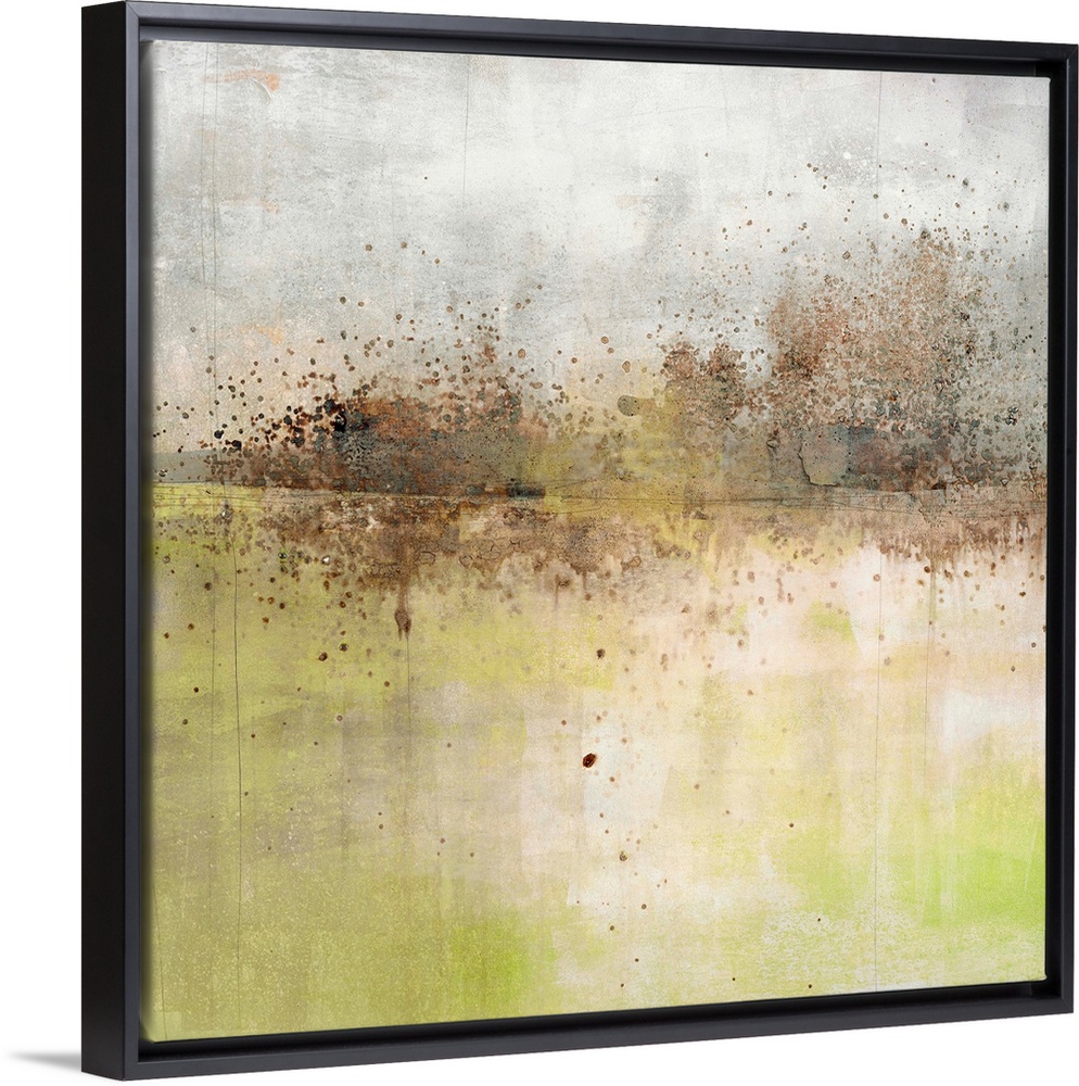 <p>Square abstract painting with a brown and black paint splattered horizon line with a grey and white sky above and light green and white land below.</p>