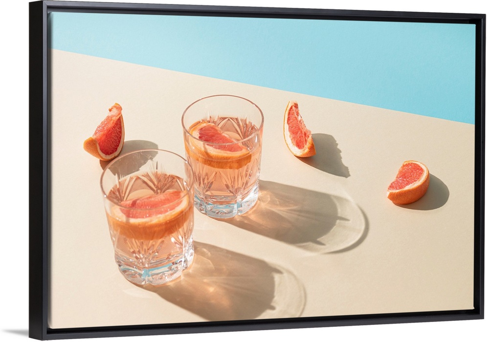 <p>Two drink glasses with slices of fresh grapefruit against a bright beige and blue background.</p>