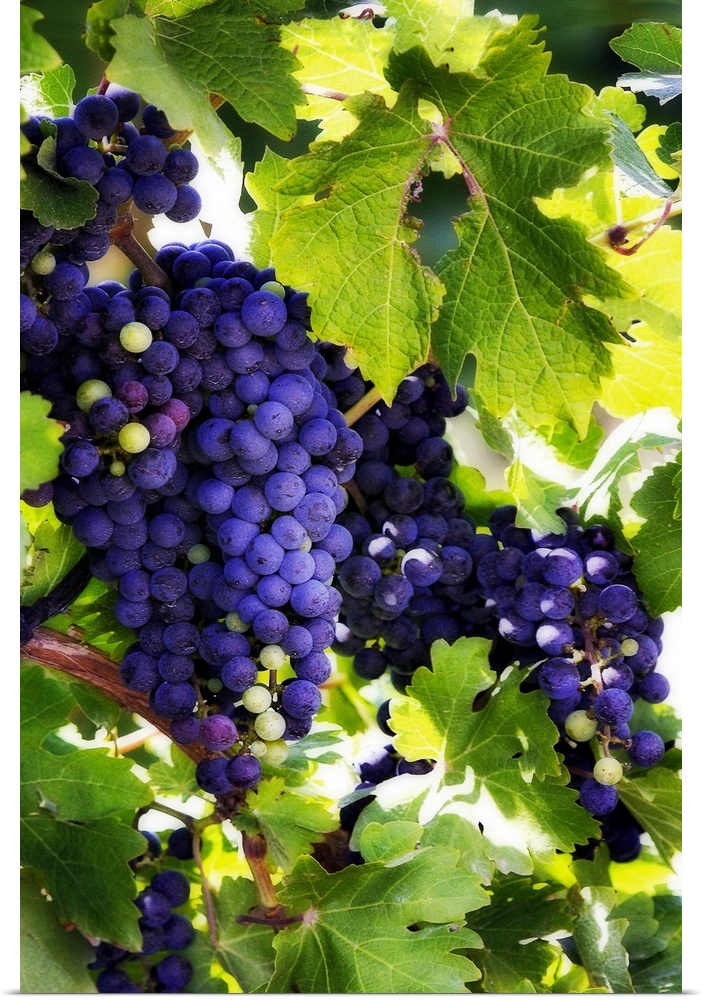 <p>Portrait photograph on a big canvas of bunches of vibrant purple grapes, hanging from the vine and surrounded by large leaves as the sun tries to peak through.</p>