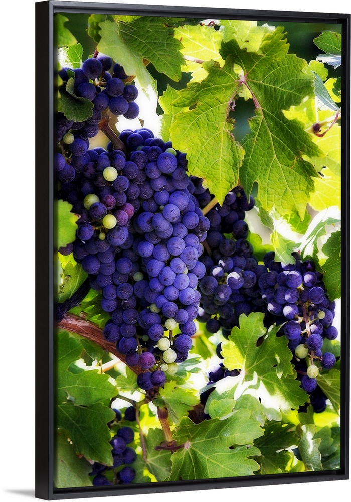 <p>Portrait photograph on a big canvas of bunches of vibrant purple grapes, hanging from the vine and surrounded by large leaves as the sun tries to peak through.</p>