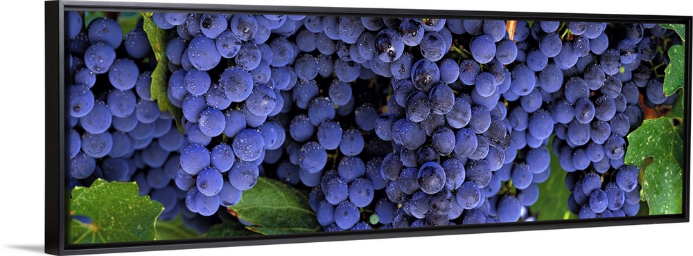 <p>Horizontal, close up photograph of several, plump bunches of grapes with water droplets, on the vine in Napa, California.</p>