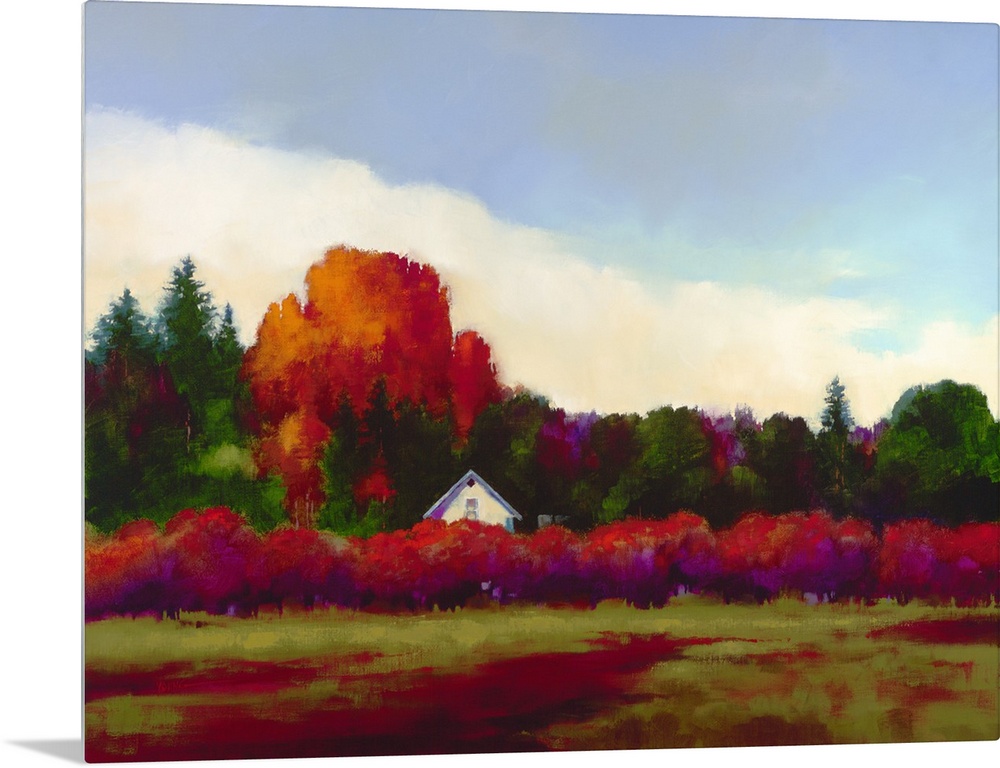 <p>Contemporary landscape painting of purple-toned vines in a field with a small white house.</p>
