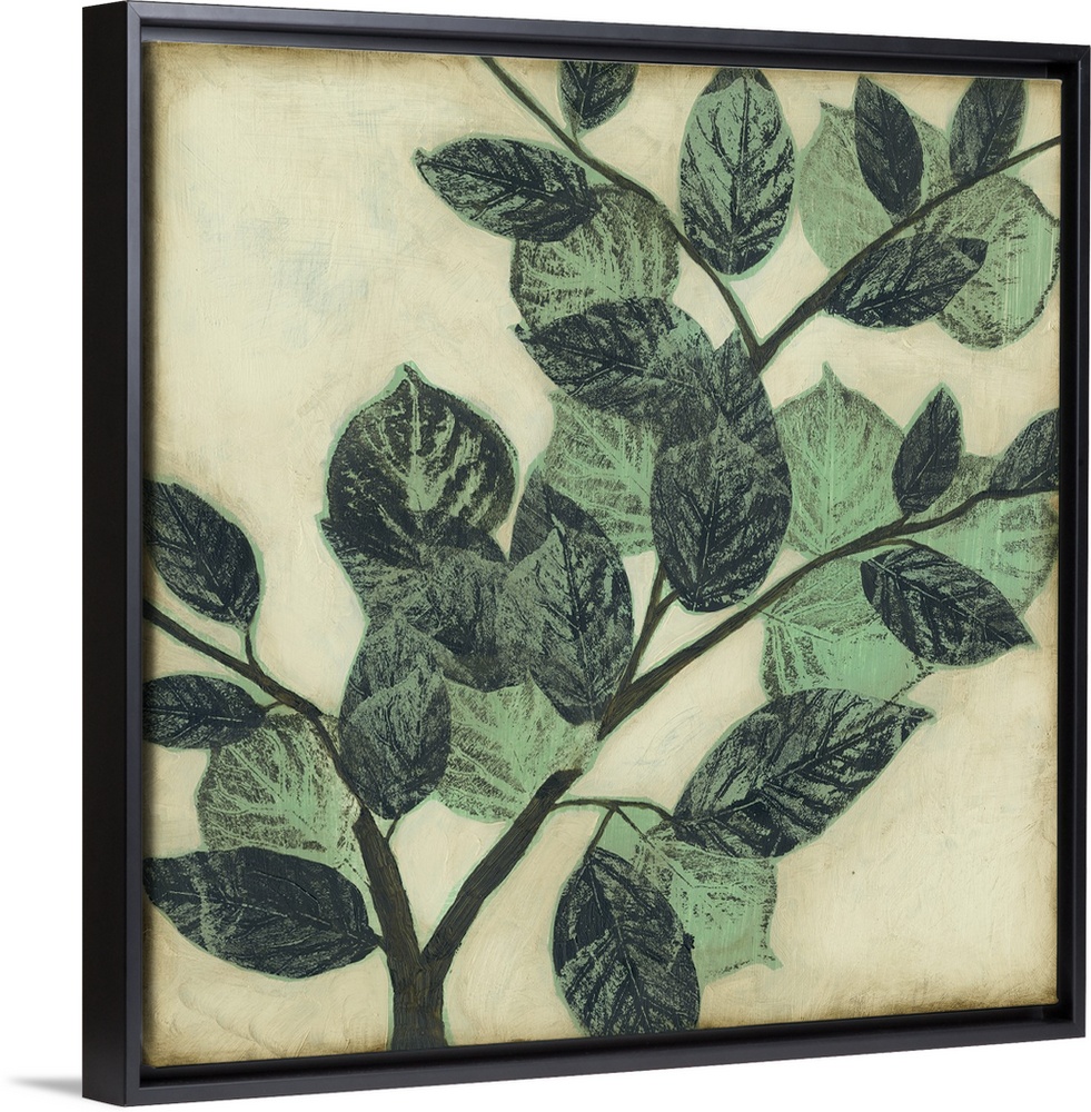 <p>Home decor artwork of muted green leaves on a twig against a light pale green background.</p>