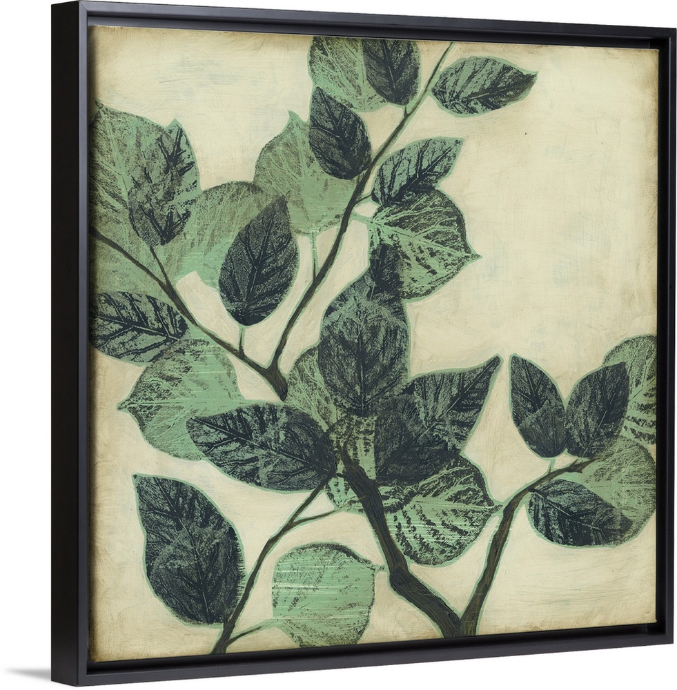 <p>Home decor artwork of muted green leaves on a twig against a light pale green background.</p>