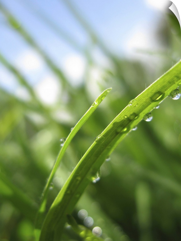 <p>macro shot of grass with water droplets in summer sunlight</p>
