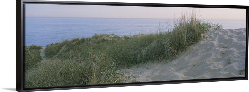 <p>Panoramic photograph of meadow on a sand pile, with the ocean in the background.</p>