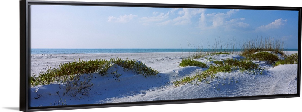 <p>Panoramic photograph shows a few patches of grass sitting on a sandy coastline within the Southeastern United States as the water of an ocean can be seen filling the horizon in the background.</p>