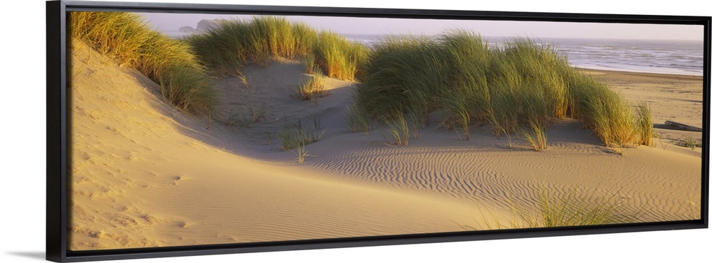 <p>Large panoramic photograph of grass and dunes in the Bandon State Natural Area in Bandon, Oregon. The calm Pacific Ocean is visible in the background.</p>
