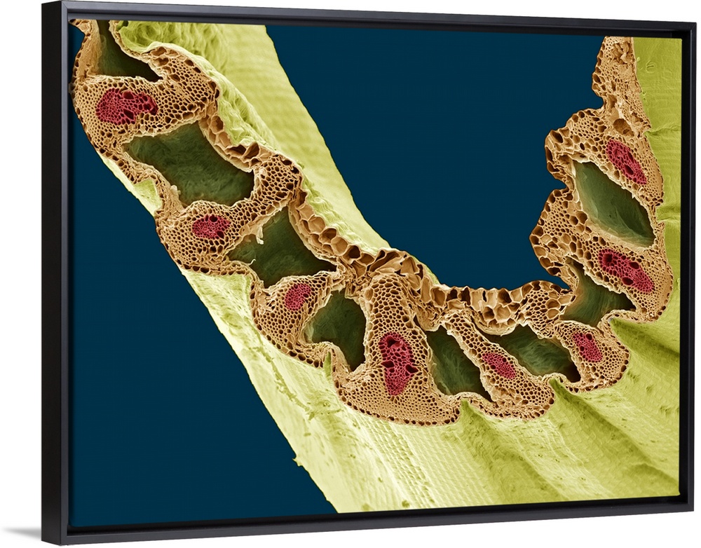 <p>Grass stem. Coloured scanning electron micrograph (SEM) of a section through a grass stem (family Graminaceae). The surface is covered in a waxy epidermis (green) that helps to prevent water loss. Within the stem are vascular bundles (red), which consist of phloem and xylem tissues. Xylem transports water and mineral nutrients from the roots throughout the plant, while the phloem transports carbohydrates and hormones around the plant. Surrounding the vascular bundles is the cortex (brown). This is made up of sclerenchyma, which is supportive tissue, and parenchyma tissue, where the primary plant functions take place.</p>