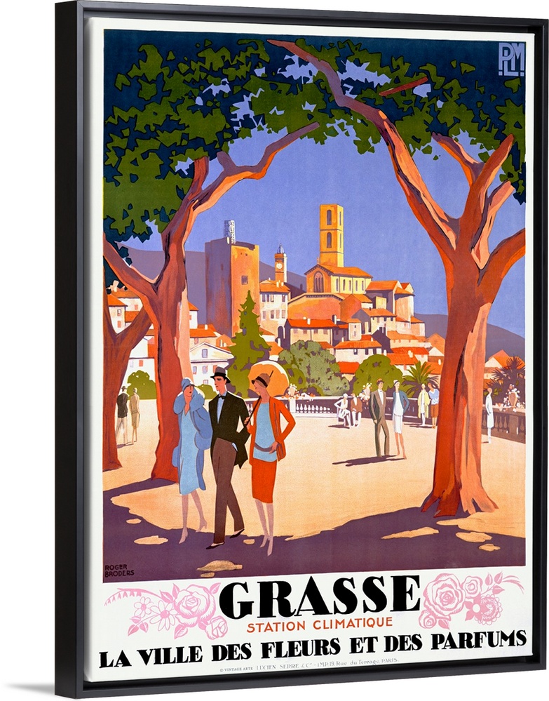 <p>Old print advertising vacation travel. A colorful image of a city is seen from between two huge trees in park filled with people. Roger Broders (1883 - 1953) French poster designer Roger Broders, is widely acclaimed for his colorful and bold travel posters. Hired by railway company Paris Lyon Mediteranoe Company (PLM), Broders' work captures the essence of vacation travel throughout France from beaches to the French Alps. This collection of Art Deco style posters epitomizes vintage travel posters of this time.</p>