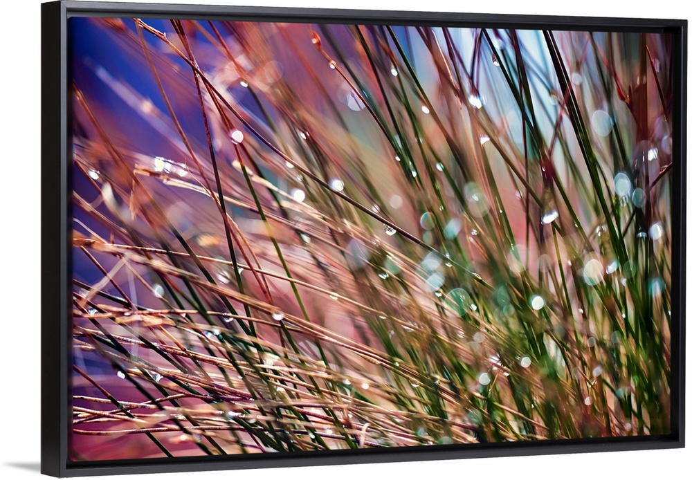 <p>Dried grasses by the side of a hiking trail high in the mountains, rain drops still on some of the grass blades. Image made with very shallow depth of field to keep a few blades/drops in focus, while blurring both the foreground and the background.</p>