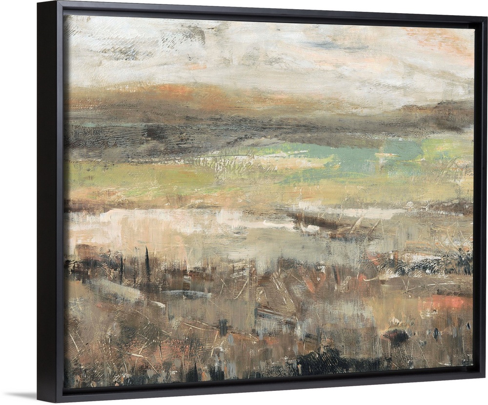 <p>An abstract landscape painting of a field done if textured tones of brown, green and cream.</p>