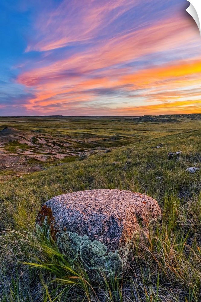 <p>Vast landscape stretching to the horizon at sunset in Grasslands National Park, Val Marie, Saskatchewan, Canada</p>