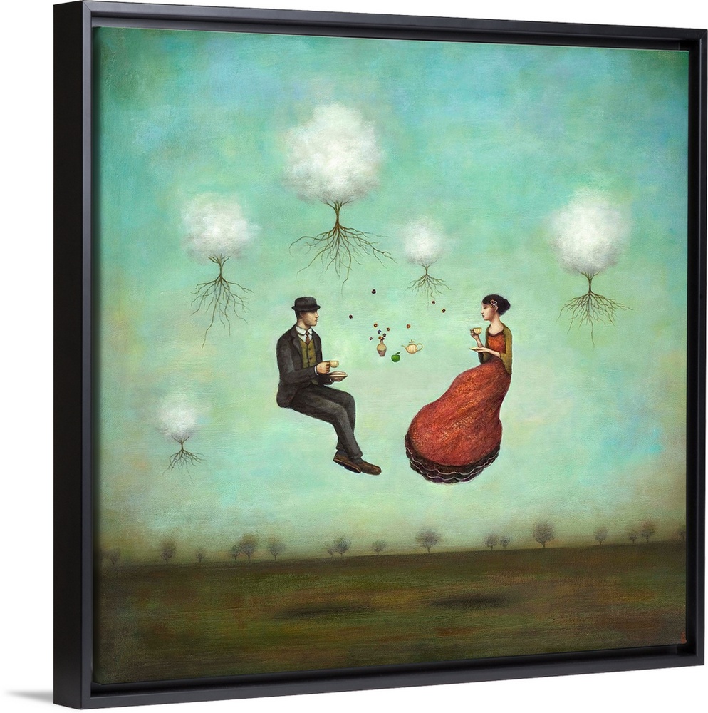<p>Contemporary surreal artwork of a woman and man having tea while floating in the air.</p>