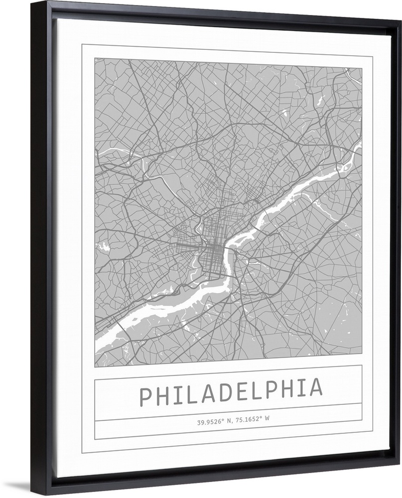 <p>Gray minimal city map of Philadelphia, Pennsylvania, USA with longitude and latitude coordinates.</p>