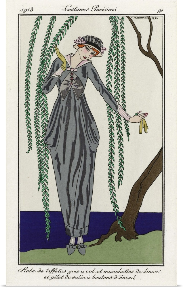 <p>Robe de taffetas gris a col et manchettes de linon et gilet de satin a boutons d'email. - Gray taffeta dress with lawn collar and cuffs and satin waistcoat with enamel buttons. Print from the high fashion magazine Journal des Dames et des Modes, published from June 1, 1912 to August 1, 1914. After a work by French illustrator George Barbier, 1882 - 1932.</p>