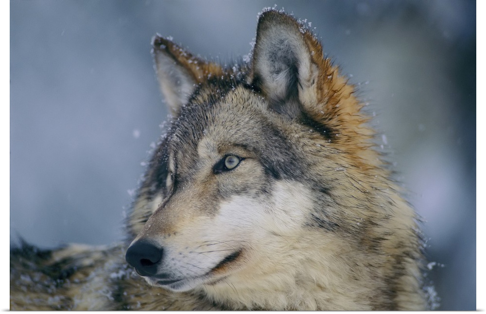 <p>Close-up portrait of a gray wolf (canis lupus) in a snowfall with snowflakes on its fur. Ely, Minnesota, united states of America.</p>