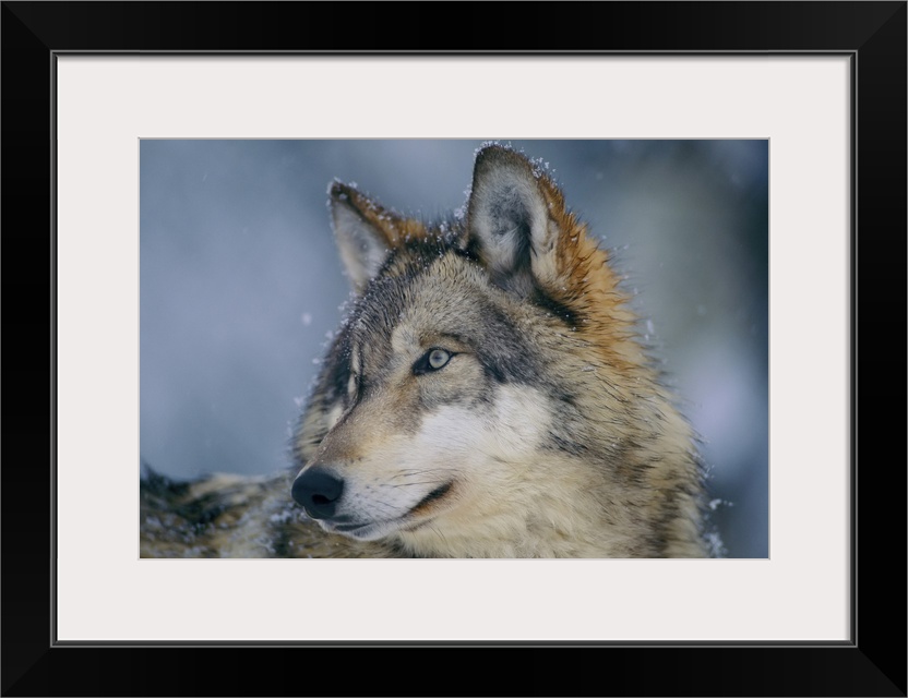 <p>Close-up portrait of a gray wolf (canis lupus) in a snowfall with snowflakes on its fur. Ely, Minnesota, united states of America.</p>