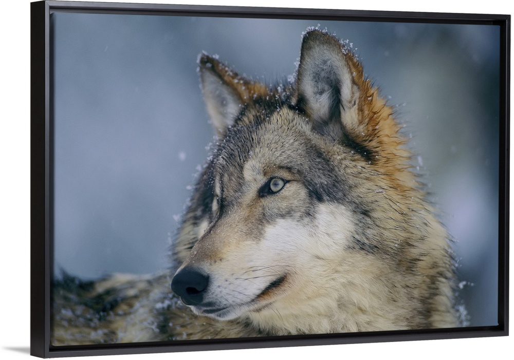 <p>Close-up portrait of a gray wolf (canis lupus) in a snowfall with snowflakes on its fur. Ely, Minnesota, united states of America.</p>