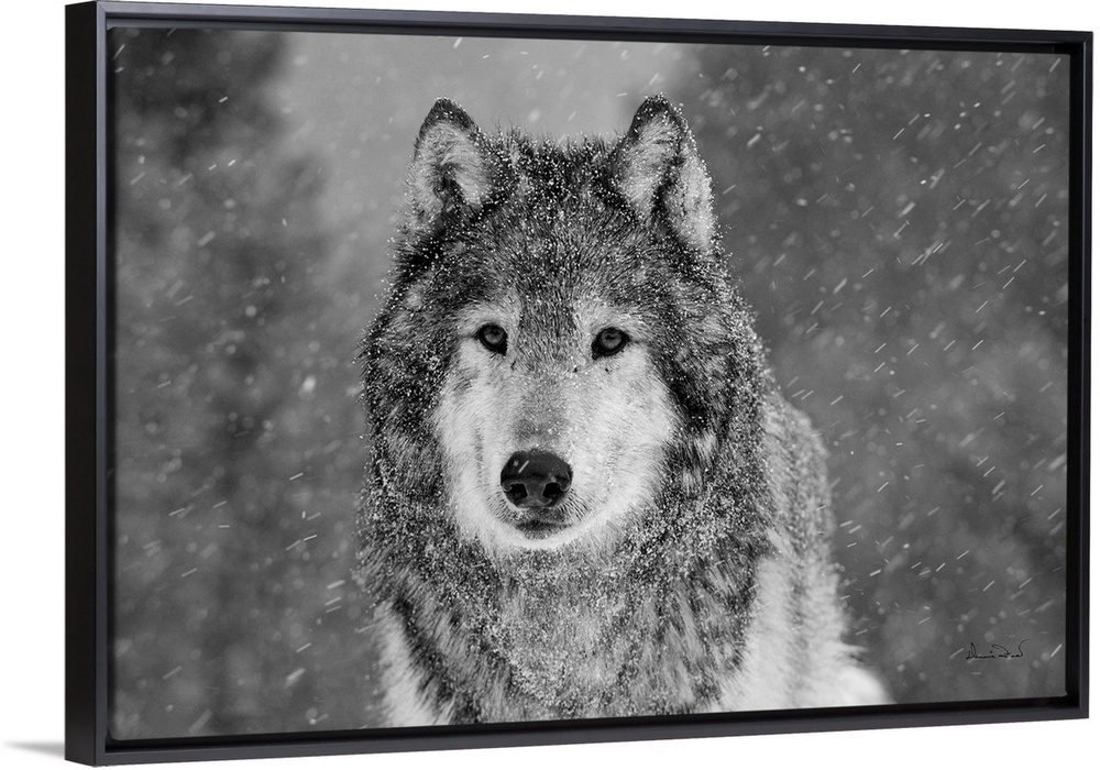<p>Black & White of captive Grey Wolf (Canis lupus) posing in its environment during a snow squall.</p>