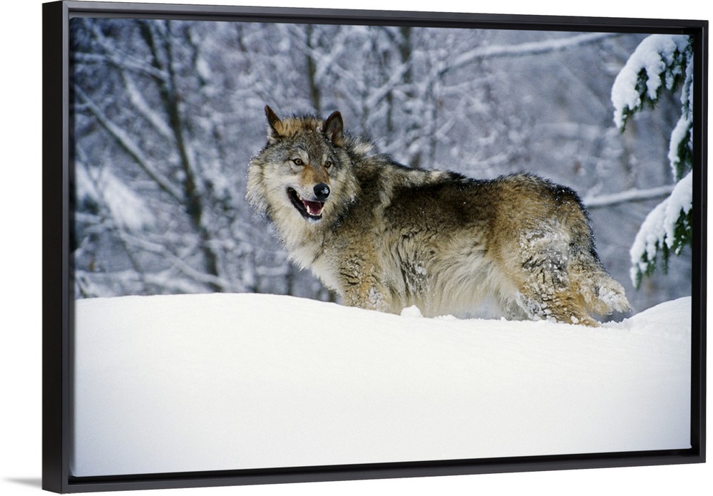 <p>Landscape, big photograph of a gray wolf standing in a snow bank, surrounded by snow covered trees, in Montana.</p>
