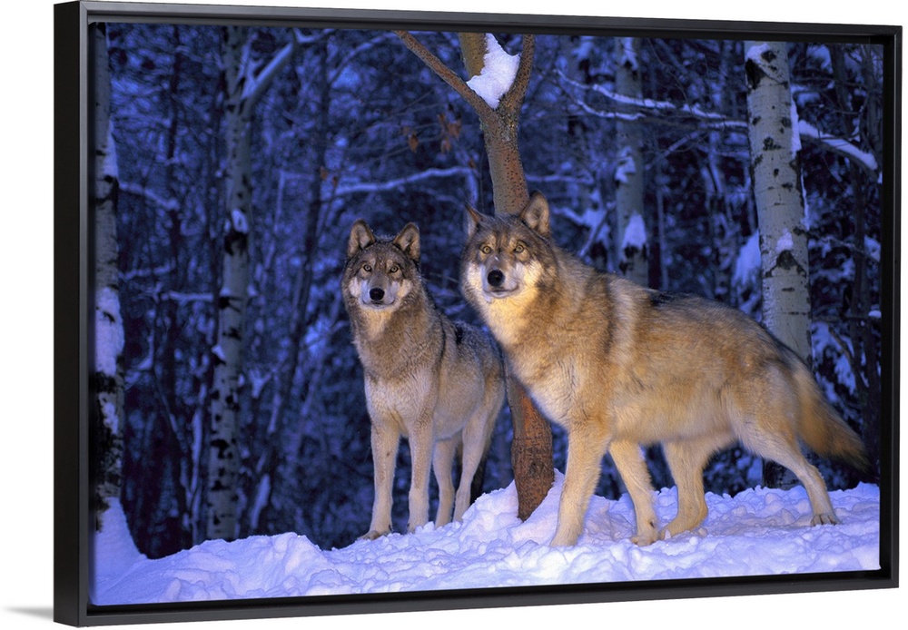 <p>Gray wolves, Canis lupus, in the new-fallen snow at the International Wolf Center.</p>