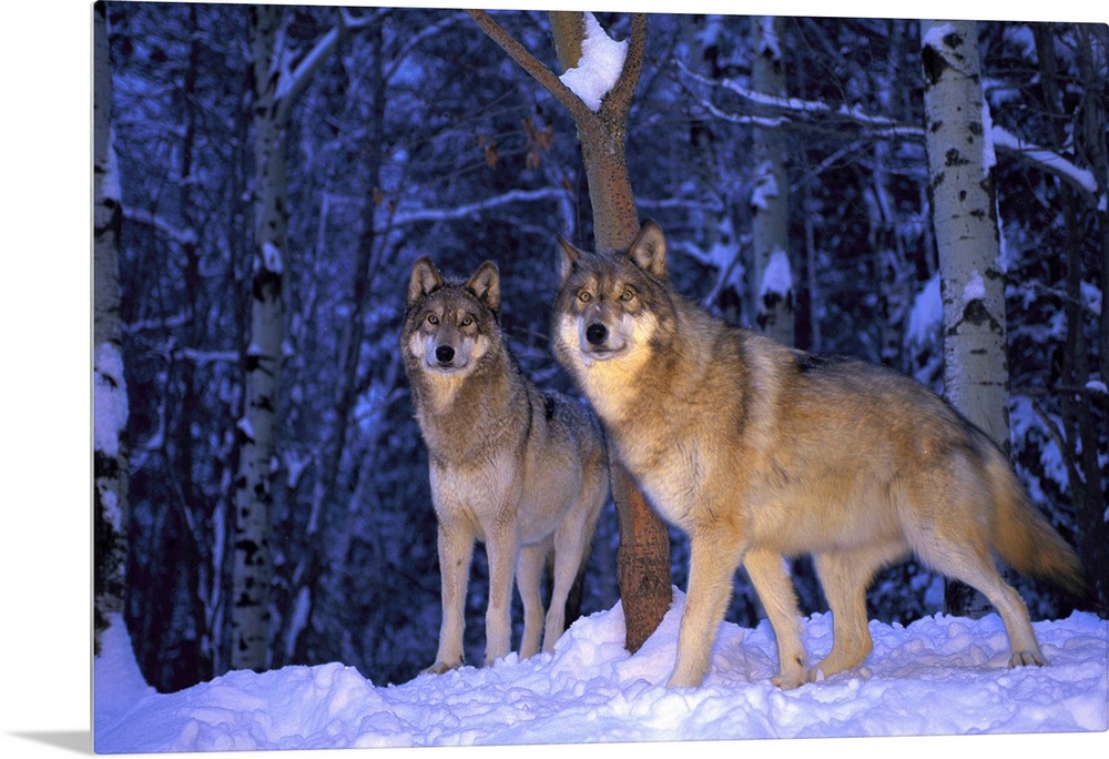 <p>Gray wolves, Canis lupus, in the new-fallen snow at the International Wolf Center.</p>