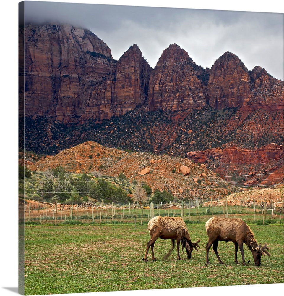 <p>With red rock formations as backdrop, molting elk grazing in pasture at Zion Canyon Elk Ranch in Springdale, Utah.</p>