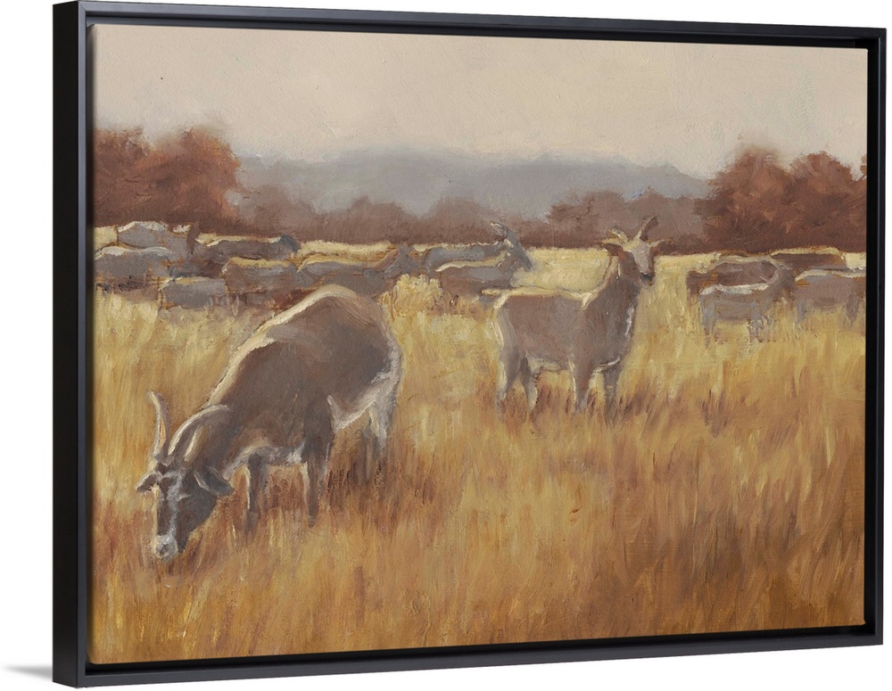 <p>A contemporary horizontal painting of a group of goats in a field with one goat looking toward the viewer.</p>