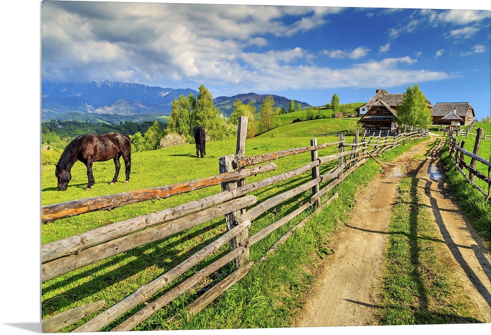 <p>Alpine rural landscape with grazing horses on the green fields, bran, Transylvania, Romania, Europe.</p>