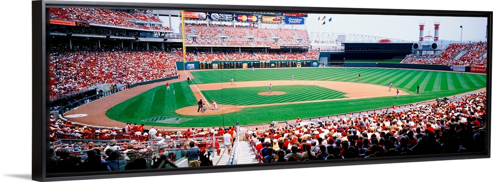 <p>A crowded baseball stadium photograph from near home plate on a panoramic canvas.</p>