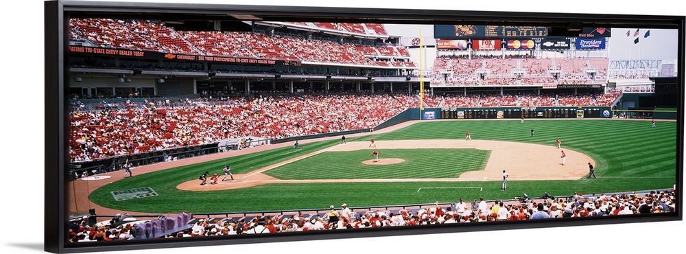 <p>Long horizontal image of a baseball game being played as spectators watch in Ohio.</p>