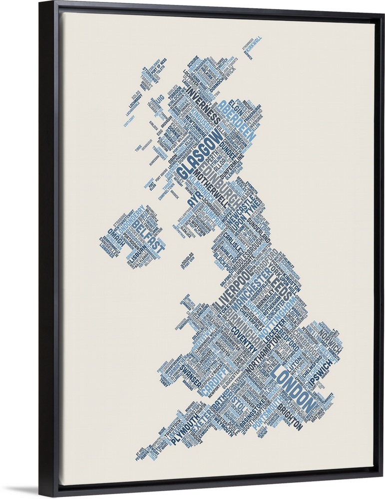 <p>Contemporary piece of artwork of a map of Great Britain made up of the names of the city names.</p>