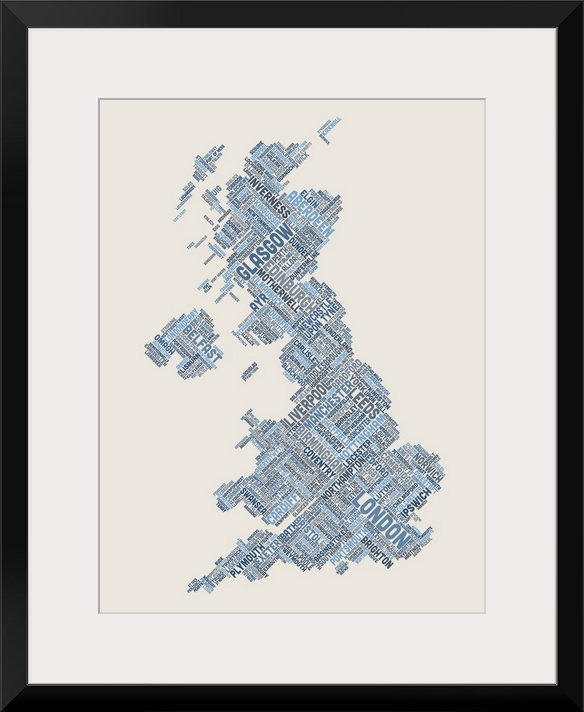 <p>Contemporary piece of artwork of a map of Great Britain made up of the names of the city names.</p>