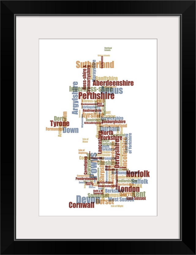 <p>A typographic text map of Great Britain. Counties within the United Kingdom are shown on the map, which is made entirely from text.</p>